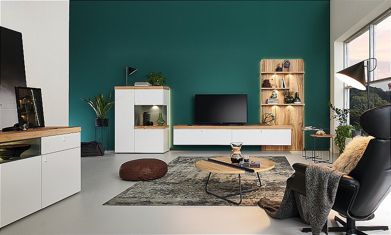 Here, lacquer and wood are elegantly combined - lacquered surfaces in crystal white enable tailored furniture set-ups. This display unit features light highlights in oak and lacquer in crystal white matte. Plan X2 ensures versatility, and adds a unique character to living rooms.