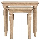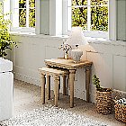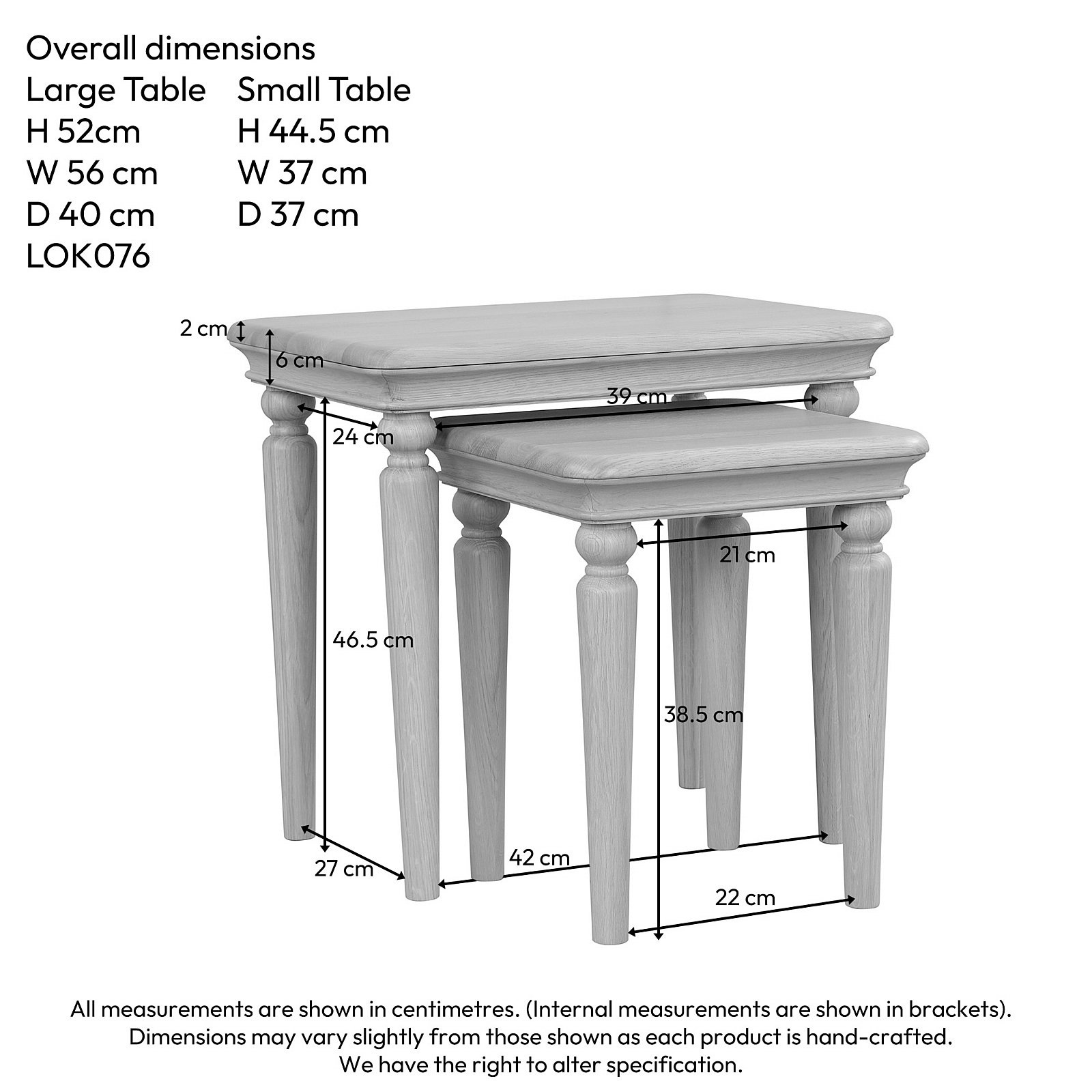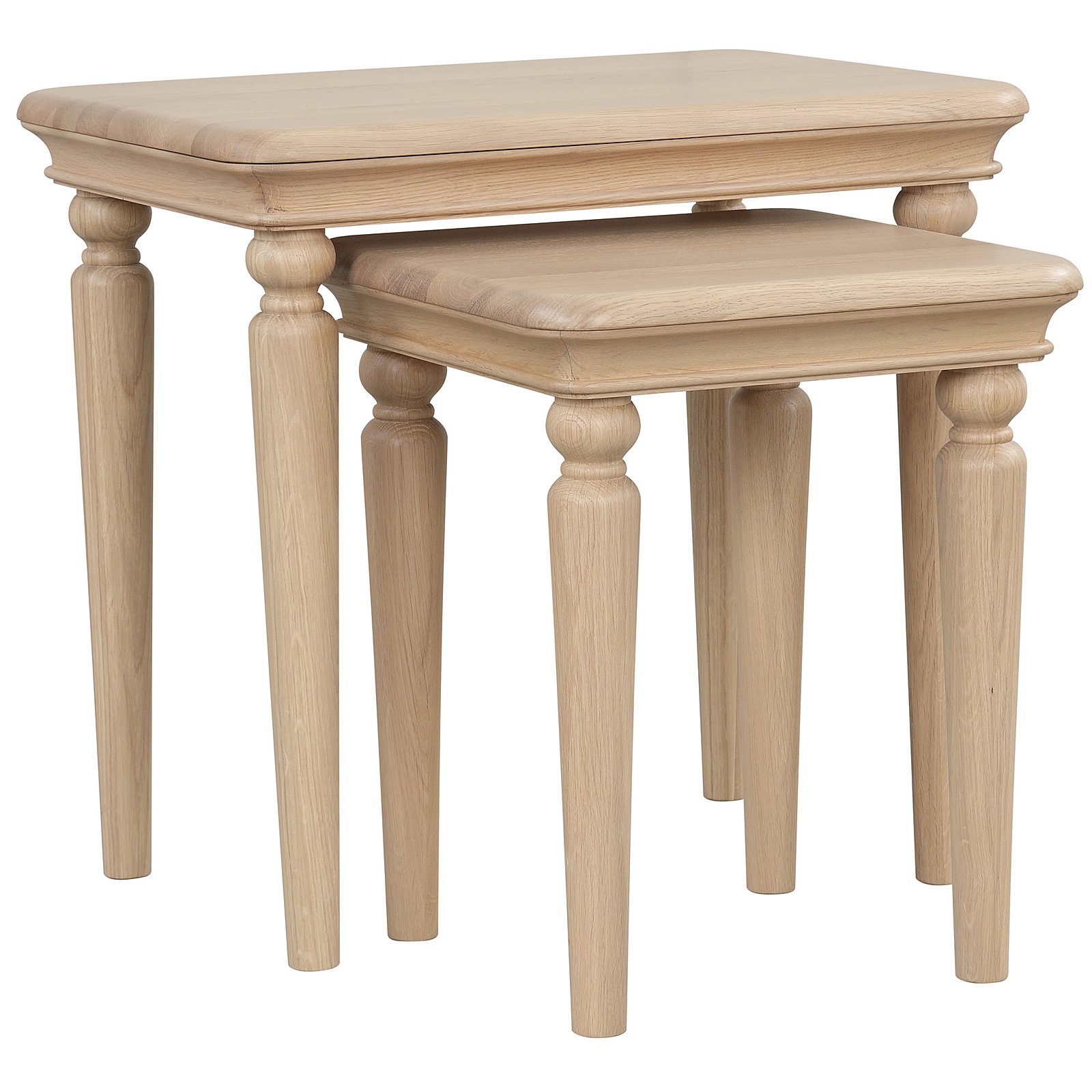The Hampshire Oak Nest of 2 Tables offers a charming and versatile addition to any living space, combining practicality with timeless appeal. Crafted from a blend of white oak, pine, and MDF, the tables feature gently rounded edges, turned legs, and solid oak tops finished with a smooth lacquer that enhances the natural grain. Their nested design allows the smaller table to slide neatly beneath the larger one, making them perfect for compact rooms or flexible use during entertaining. Whether used together or separately, they provide ideal surfaces for drinks, books, or decorative items. Finished in all-over pale oak, they coordinate beautifully with the wider Hampshire Collection.