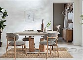 You can pair the Forma table with two different chair styles: a comfortable fabric seat with a natural wood frame, or a fully upholstered faux leather option. The table and its complementary chairs create a complete and elegant dining set that will enhance any home, offering a perfect combination of style, practicality, and enduring quality.