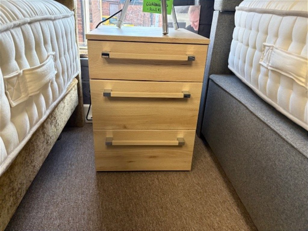 Enhance your bedroom with this practical, modern three-drawer bedside table. Featuring a beautiful Oak finish and striking chrome details, its drawers operate smoothly on reliable runners. This popular piece is part of a larger collection and is currently on offer with a significant discount. It's ready for immediate delivery, so don't miss the chance to upgrade your space straight away!