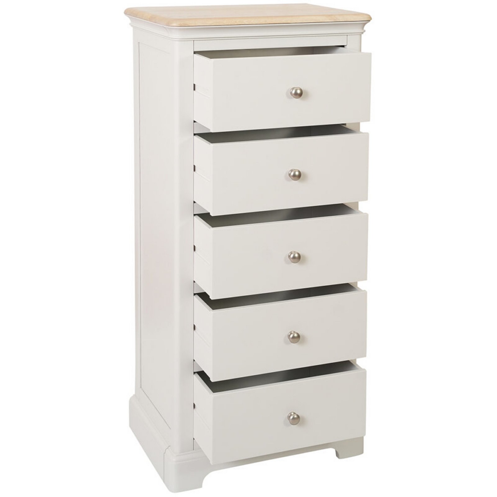 Designed with practicality and elegance in mind, the Hampshire 5 Drawer Wellington Chest offers generous vertical storage without taking up excessive floor space. Crafted from solid oak, pine, and MDF, and finished in a soft Grey Mist with lightly lacquered oak tops, this tall chest features five spacious drawers ideal for organising clothing, accessories, or household items.