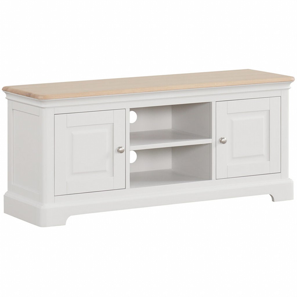 Designed to accommodate larger televisions, this unit offers generous surface space along with practical storage options, including two cupboards and open shelving for media devices, consoles, or decorative items. Its classic panelled doors and brushed metal handles add a touch of traditional charm, making it a versatile addition to both modern and country-style interiors.