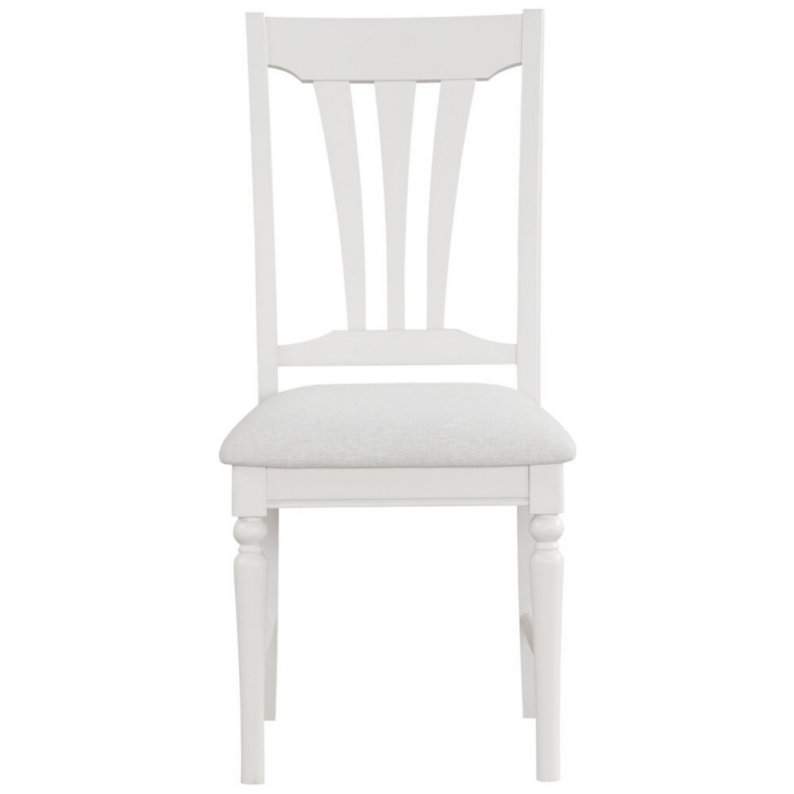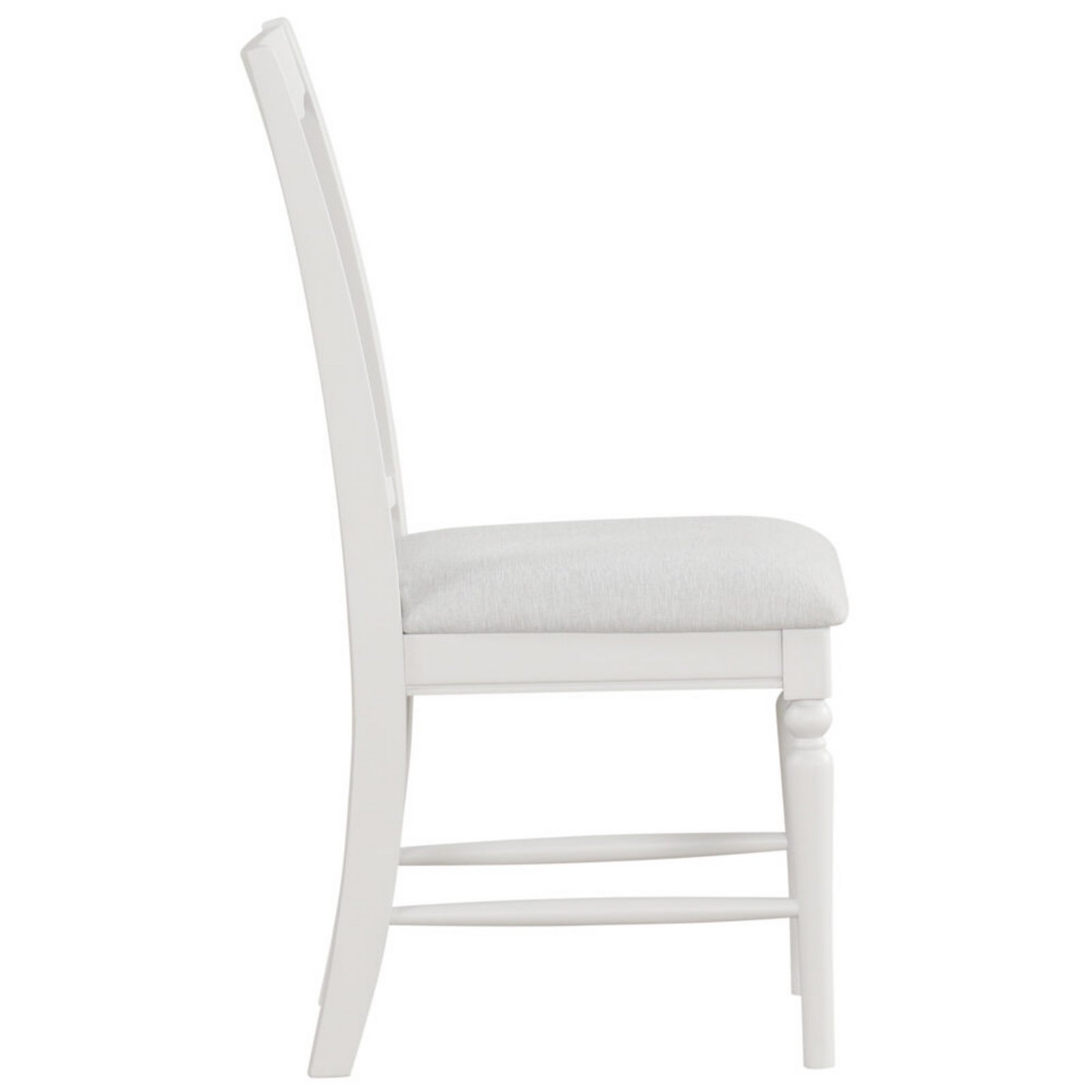 It features a three-rail backrest that offers both support and style, while the padded seat - upholstered in a neutral fabric - adds a layer of comfort ideal for long meals and gatherings. The chair’s elegant proportions and subtle detailing, including rounded edges and sculpted legs, reflect traditional craftsmanship with a contemporary twist.