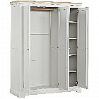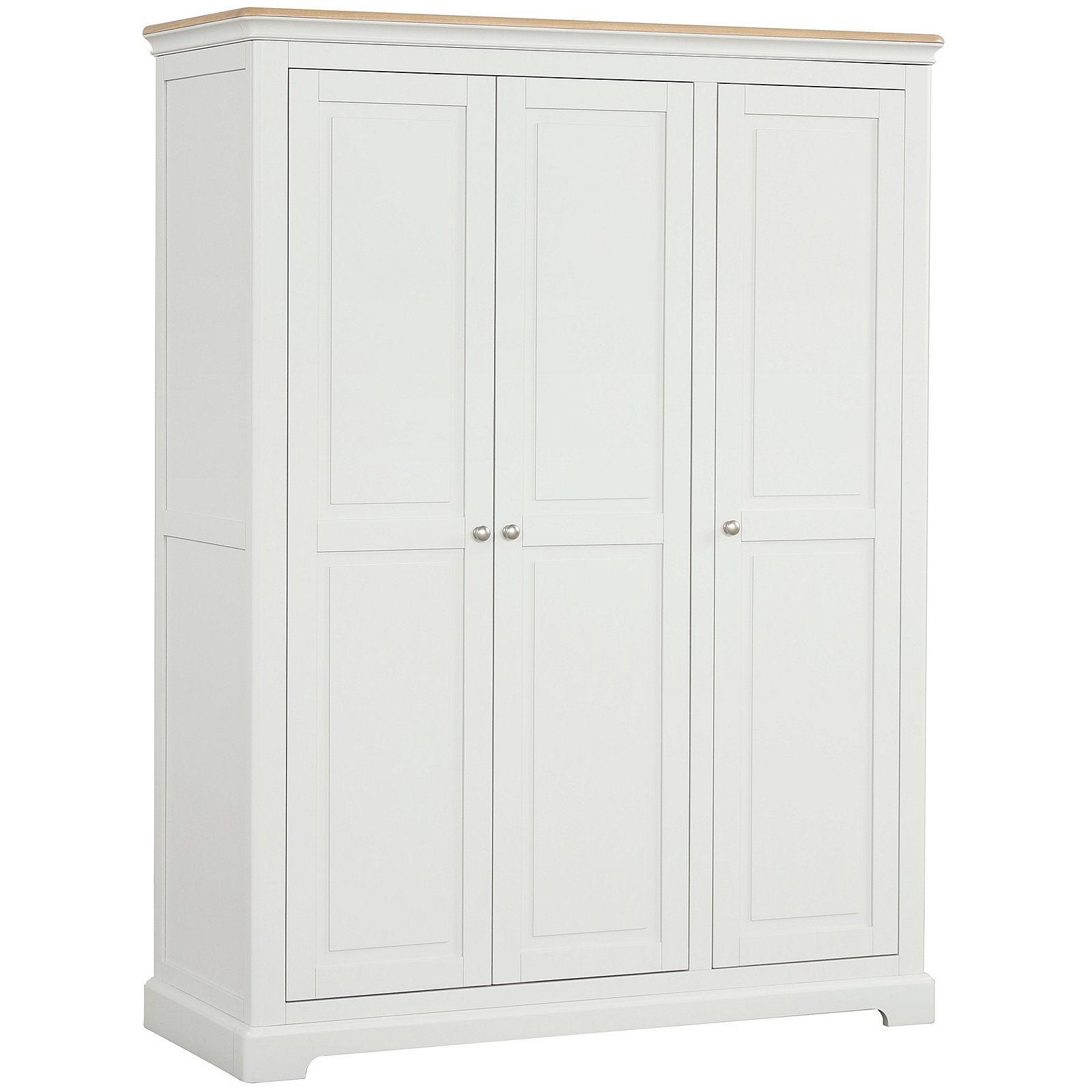 The triple wardrobe offers generous storage space, featuring a combination of hanging sections and shelving to keep clothing and accessories neatly organised. Its free-standing design makes it versatile for different room layouts, while the painted finish with natural oak tops adds a touch of sophistication.