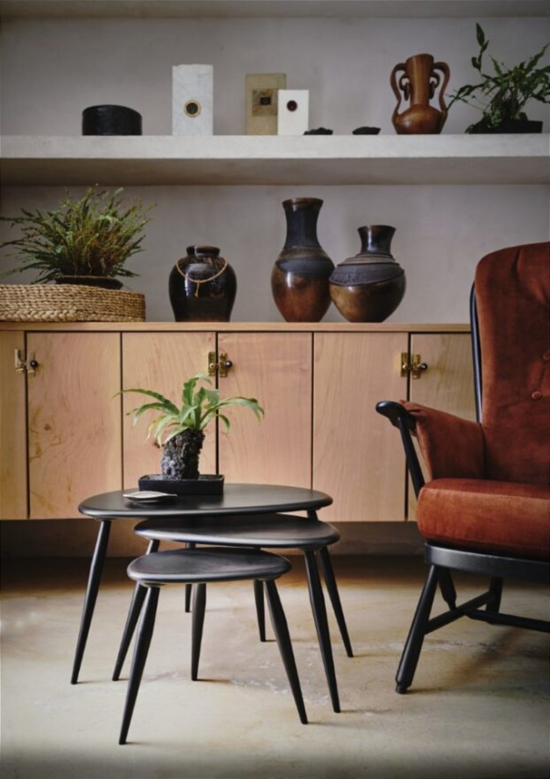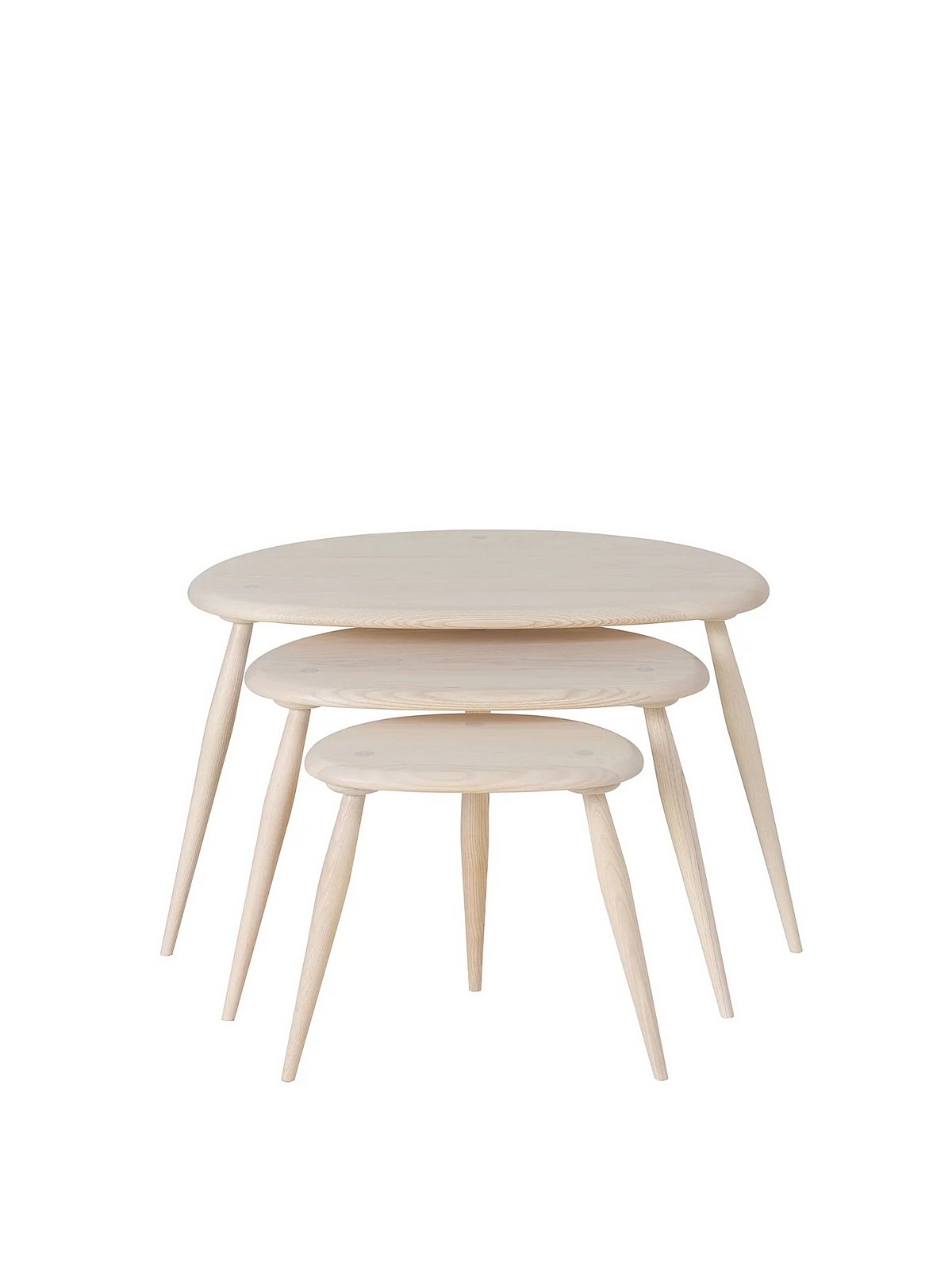 The Ercol Pebble Nest of Tables is a design icon from the 1950s, and this functional trio is a popular choice. Crafted from quality solid ash, the set features three tables with smoothly shaped, organically curved tops and slender, tapered legs, reflecting timeless mid century elegance. The inherent quality and enduring structure of this piece make it a lasting investment for any home.