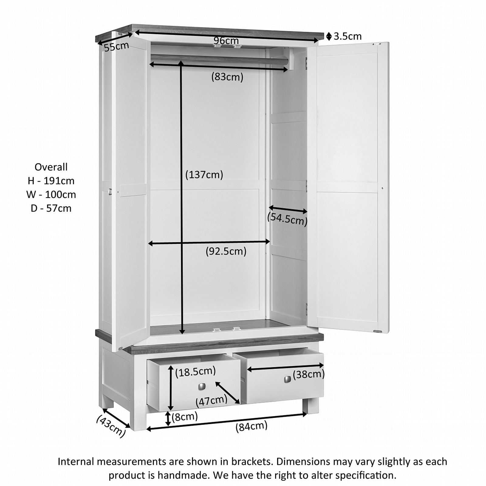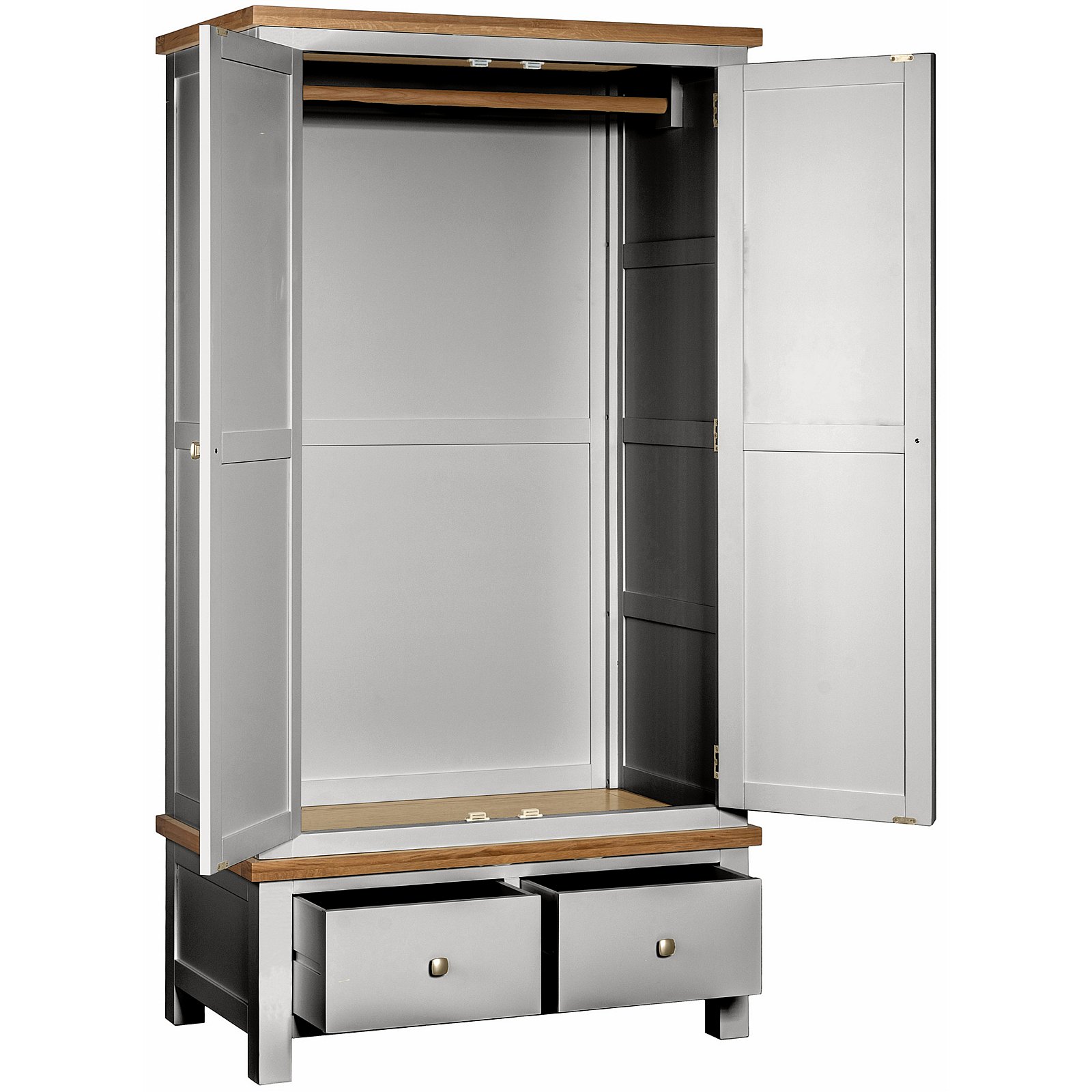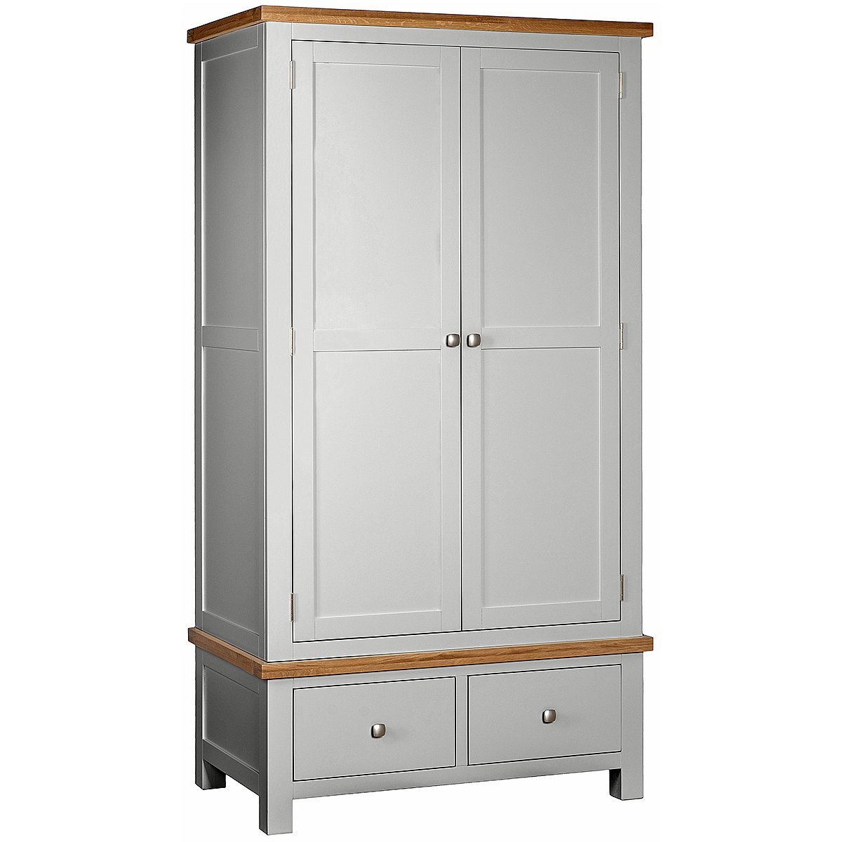 The Oxford Painted double wardrobe with 2 drawers brings together generous storage, elegant styling and practical design. This well‑proportioned wardrobe features a full‑width hanging rail ideal for shirts, dresses and coats, paired with two deep drawers at the base that offer additional space for folded clothing or accessories. Crafted from white oak, pine and MDF, it showcases smooth straight lines, robust panelled doors and dovetailed drawers, all finished in a durable painted body with a contrasting light‑lacquered oak top for added character. Supplied with both square metal knobs and classic wooden knobs, it allows you to tailor the look to your décor, and provides a stylish, long‑lasting storage solution for any bedroom.