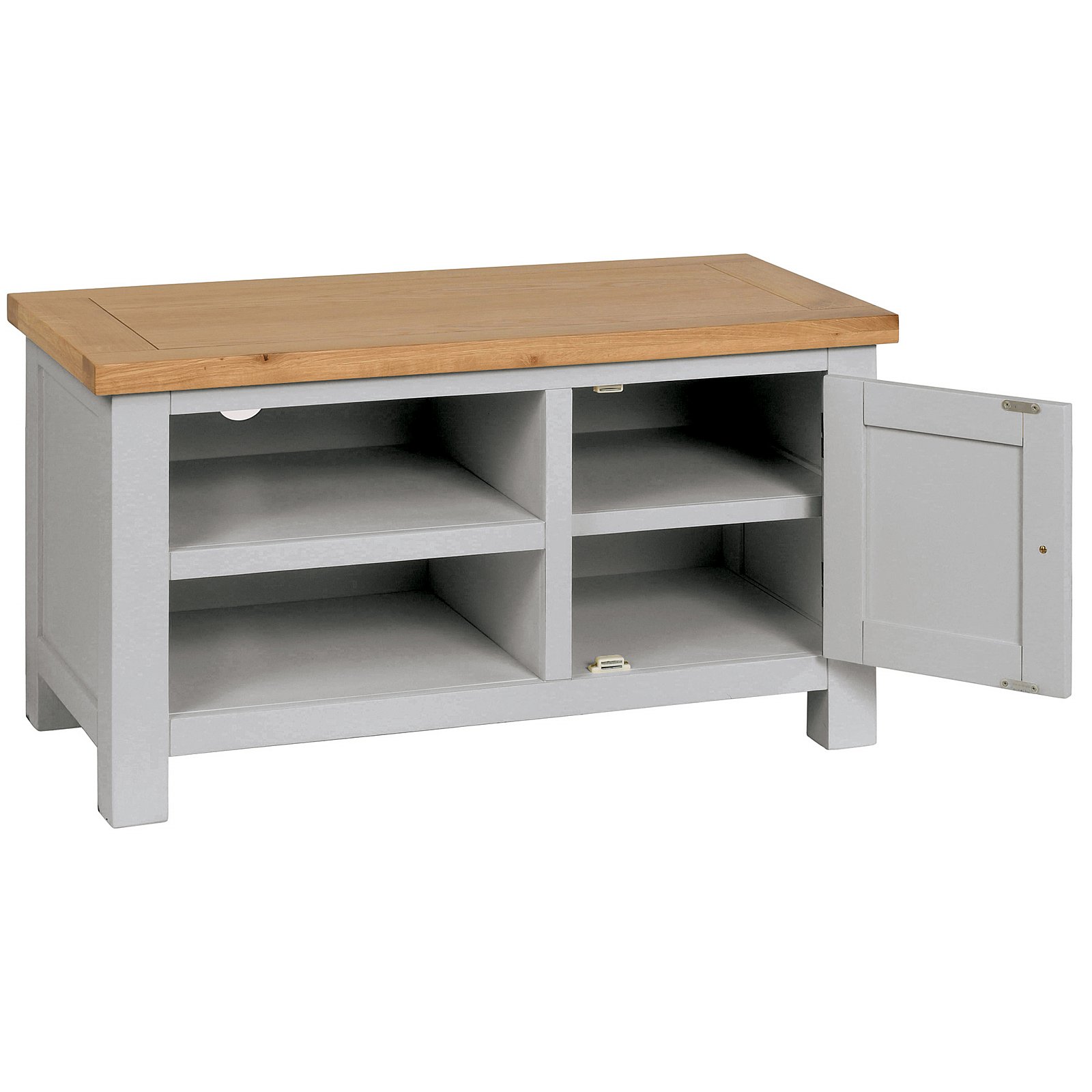 The Oxford Painted Standard TV Unit offers a stylish and practical solution for organising your home entertainment setup. Expertly crafted with a painted body and a contrasting lacquered oak top, it features clean straight lines and a compact design ideal for smaller living rooms or snugs. The unit includes two open sections for media devices and a small cupboard for additional storage, complete with both modern square metal and classic wooden knobs for customisation.