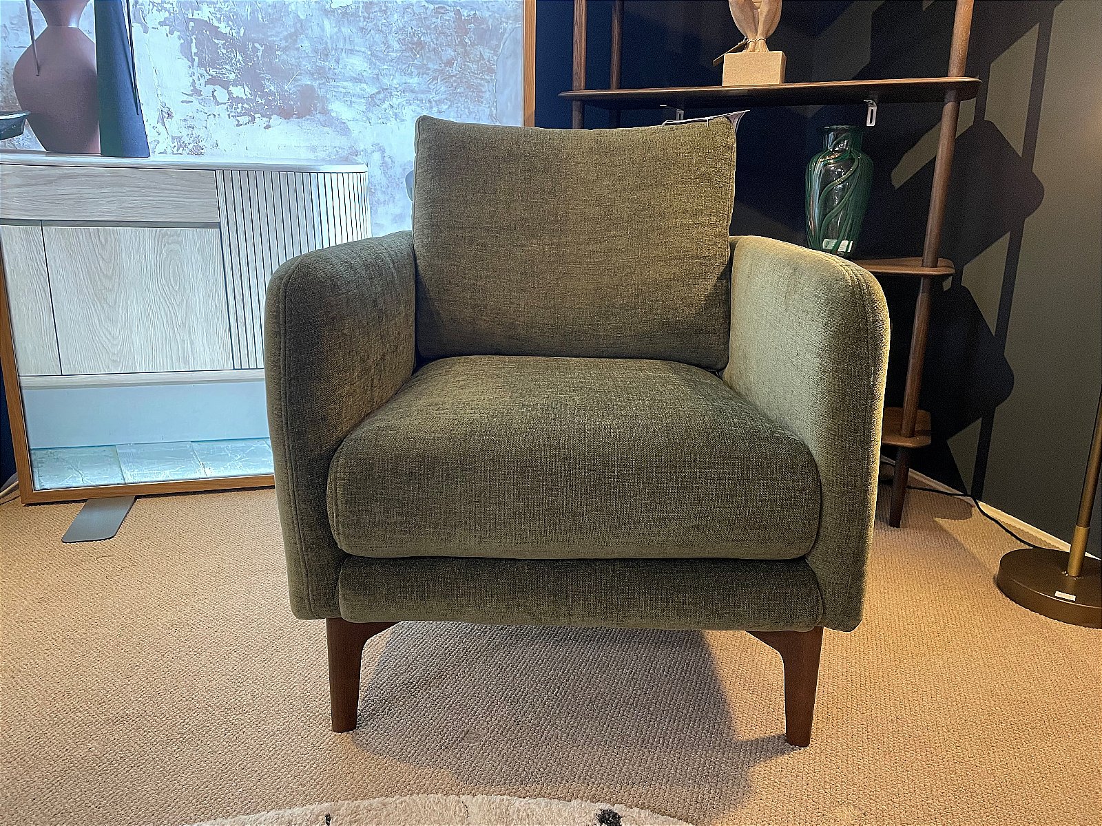 The Aosta armchair is upholstered in a khaki green textured fabric. These armchairs are designed for both comfort and contemporary style. Each Aosta armchair is upholstered in premium fabric, providing a soft and luxurious feel, while the robust frame ensures lasting durability.