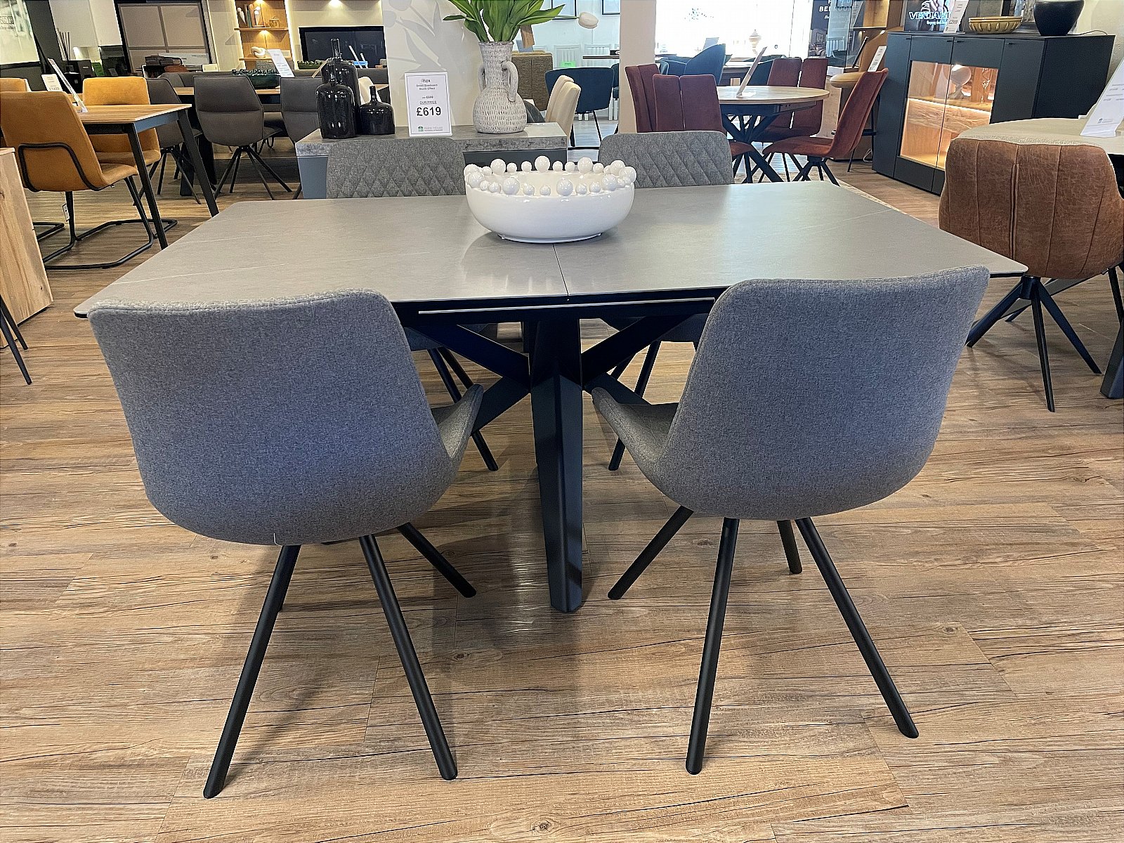 Enjoy cosy dinners with friends and family! With its convenient manual extension system and ceramic top, this table is perfect for both everyday use and larger gatherings. Its sleek, black metal cross legs offer both functionality and a contemporary touch to your dining room! This set includes 4 Sigma Dining Chairs, which feature a striking quilted fabric seat on a black frame.